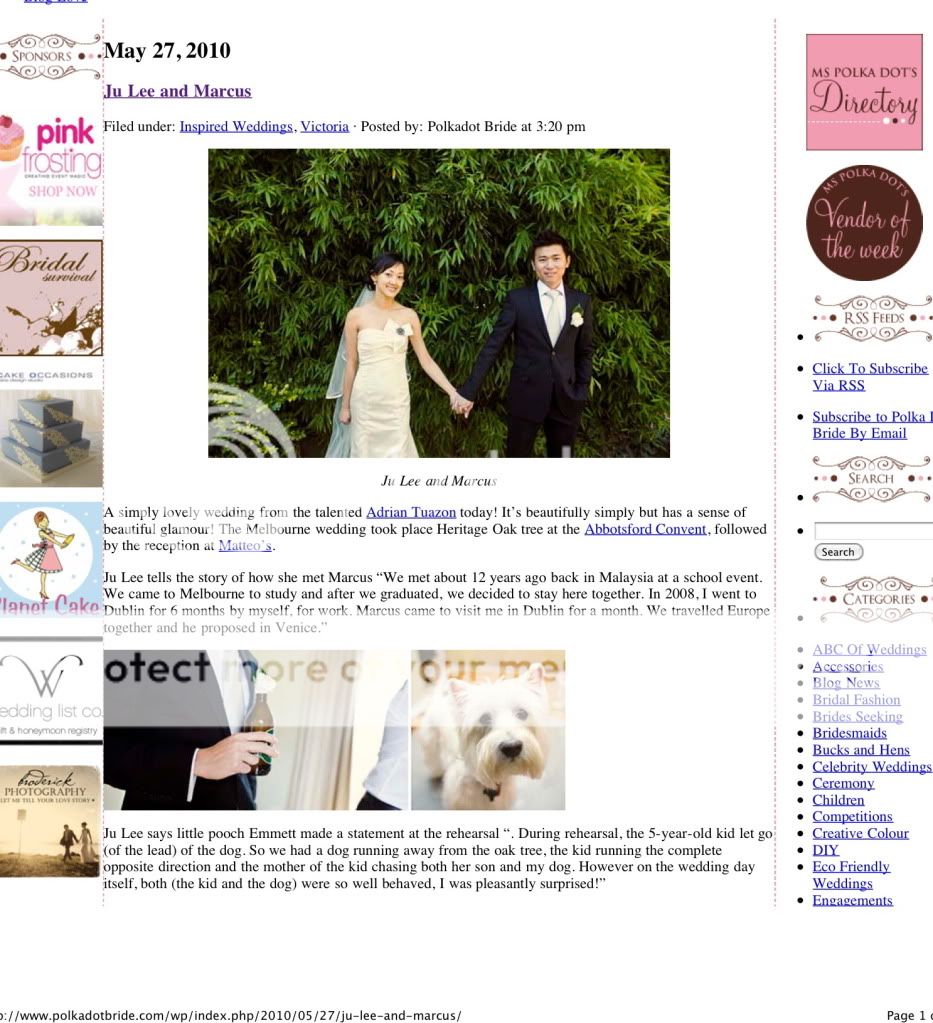 When our wedding photographer contacted me to say Miss Polka Dot Bride wanted to feature my wedding on her website, I was ecstatic! OMG Polka Dot Bride... wedding blogger extraordinaire! That was easily two months ago. And so I waited, and I waited, and finally! Thursday May 27th arrived and my wedding feature was published! Whoop whoop!