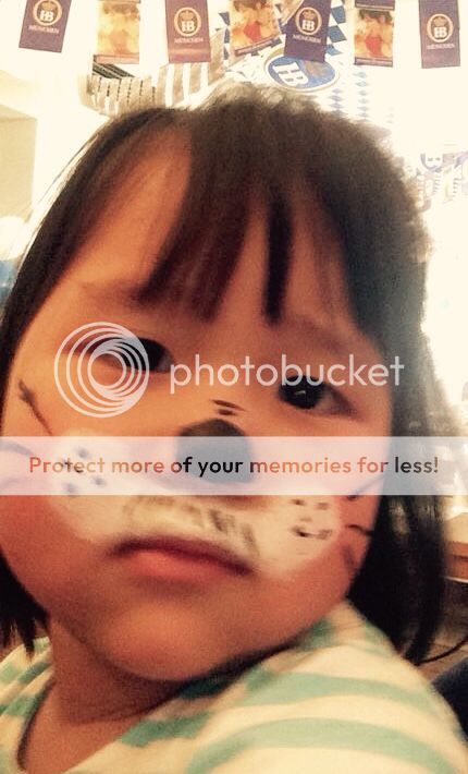 Yesterday, at the last minute, I organised lunch at a german restaurant to celebrate Oktoberfest. There was face painting for kids, and so I asked the girl to paint Little Bambi as a cat. This has got to be one of the worst face paintings ever, but oh well, the girl that did it came personally to our table and offered it, which was a nice thing to do. When I said to Little Bambi 'Lets take a selfie', she saw her face and wanted to wipe it off immediately!